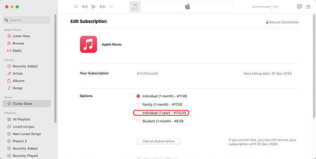 Step 4. Select Individual (1 Year) to switch to the annual Apple Music subscription.