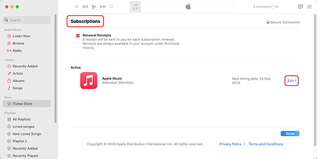 Step 3. Click the Edit icon next to your Apple Music subscription. This will display all available options for switching plans.